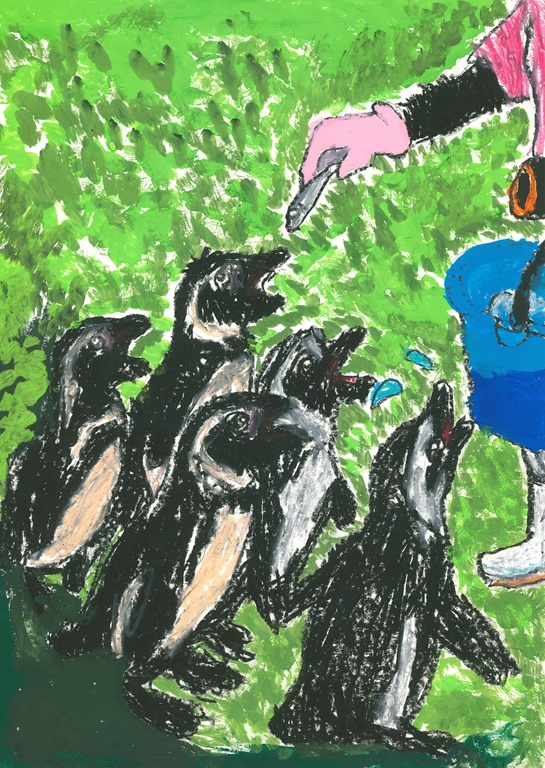 ペンギンさんたちが生き生きと描かれており、まさに『ちょうだい!ちょうだい!』という鳴き声が今にも聞こえてきそう…!