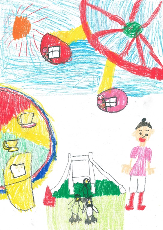 色遣いも元気いっぱい! ペンギンの行進や遊具など、のびのびと描かれていて、とっても素敵です!